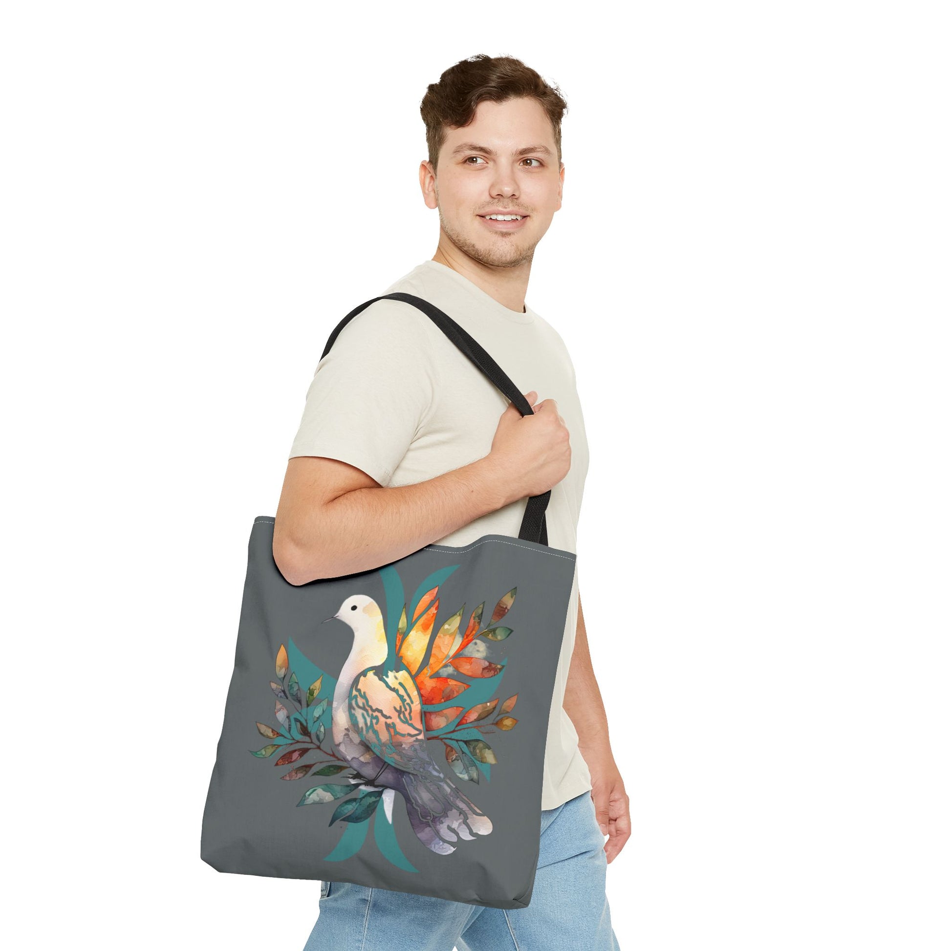 Nature-inspired Dove Peace design on a grey tote bag, giving a peaceful and calming vibe. Perfect for nature lovers and those who appreciate art. Ideal for carrying groceries, books, or everyday essentials. Relevant for Earth Day, International Day of Peace, or as a thoughtful gift for a loved one.