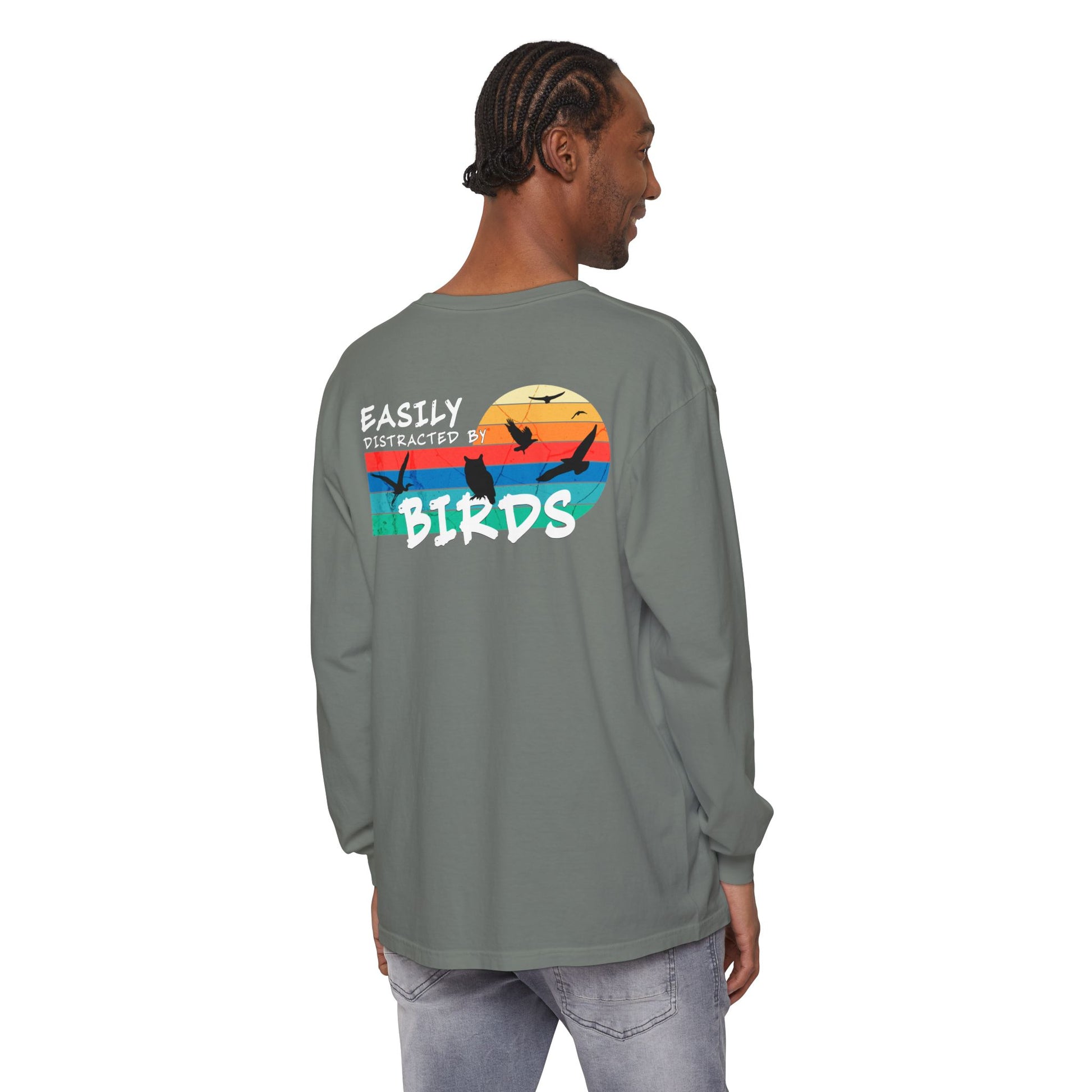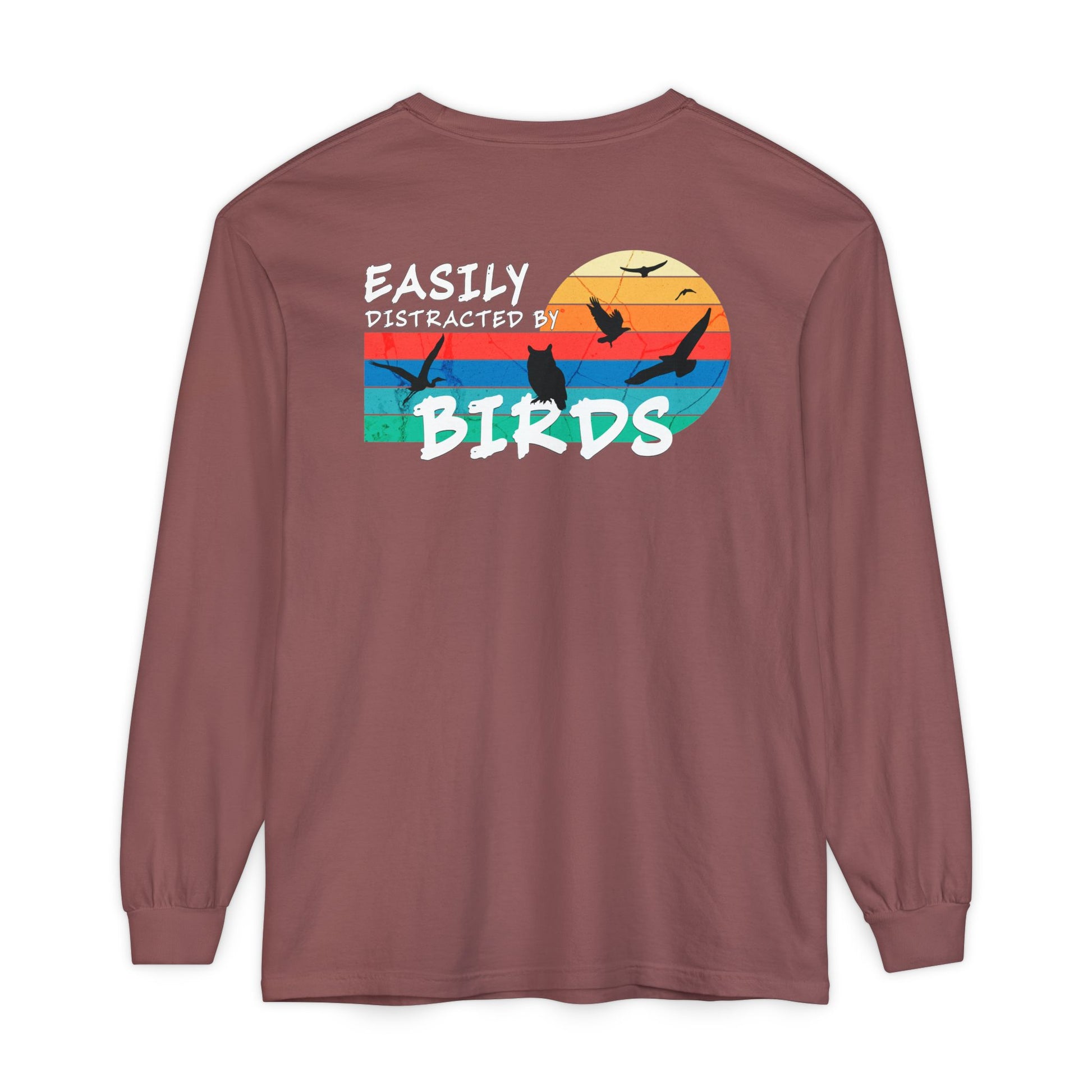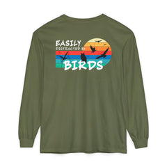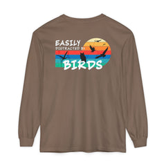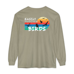 Easily Distracted by Birds Sunset on Back Long Sleeve Tee