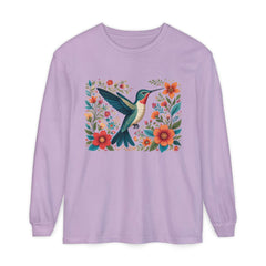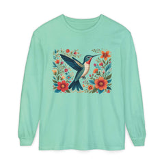 A charming Long Sleeve T-Shirt featuring a Hummingbird surrounded by flowers, giving off a whimsical and nature-inspired vibe. Perfect for nature lovers and those who appreciate intricate designs. Ideal for casual outings, nature walks, and springtime celebrations.