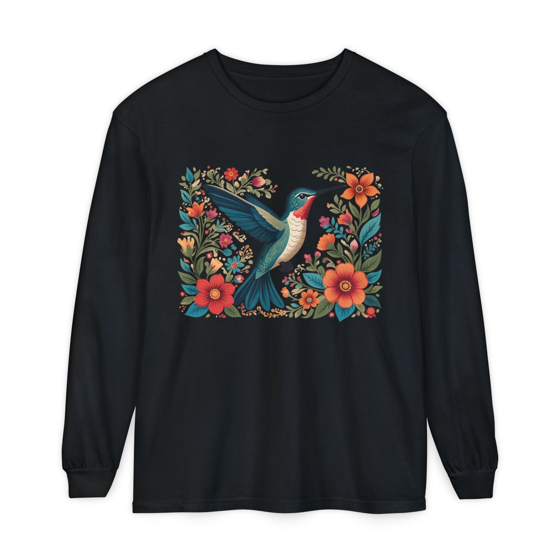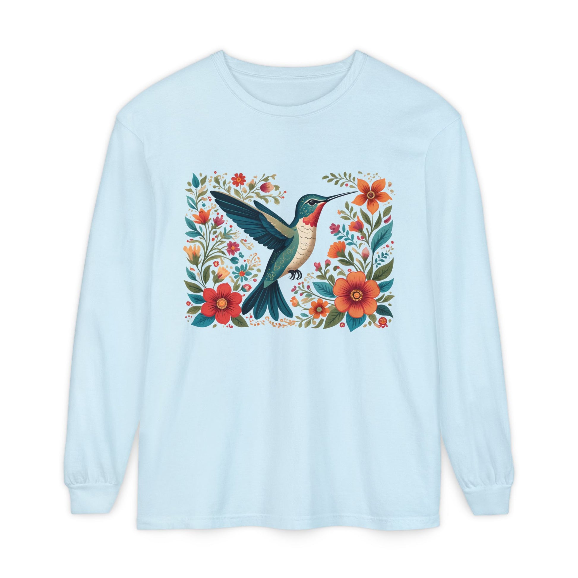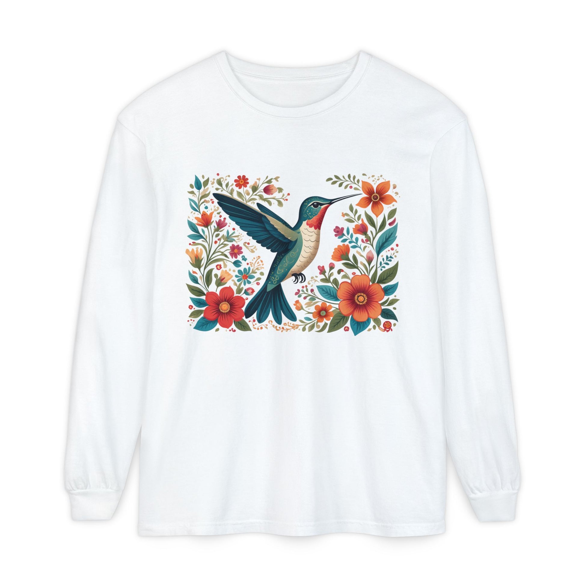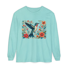 A charming Long Sleeve T-Shirt featuring a Hummingbird surrounded by flowers, giving off a whimsical and nature-inspired vibe. Perfect for nature lovers and those who appreciate intricate designs. Ideal for casual outings, nature walks, and springtime celebrations.