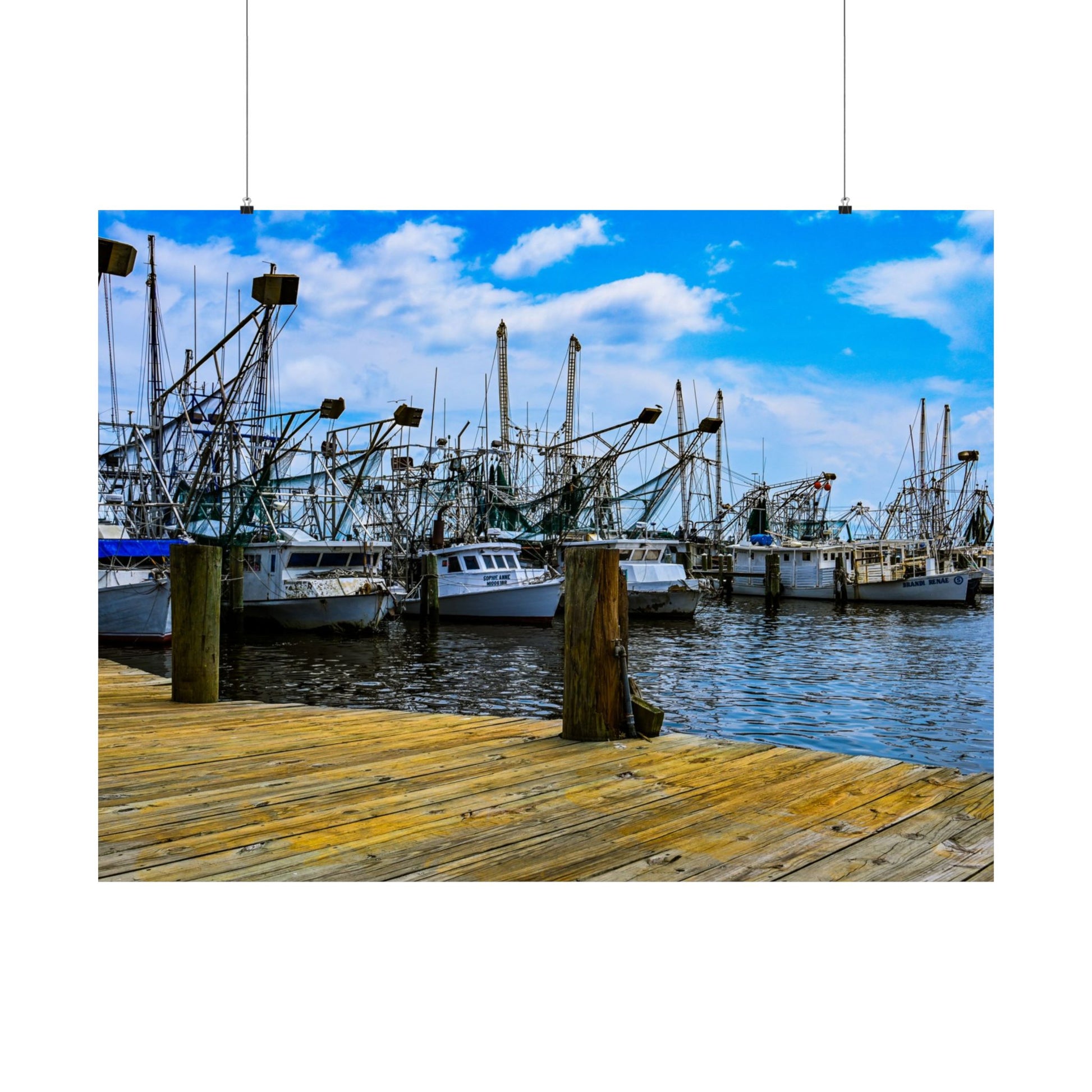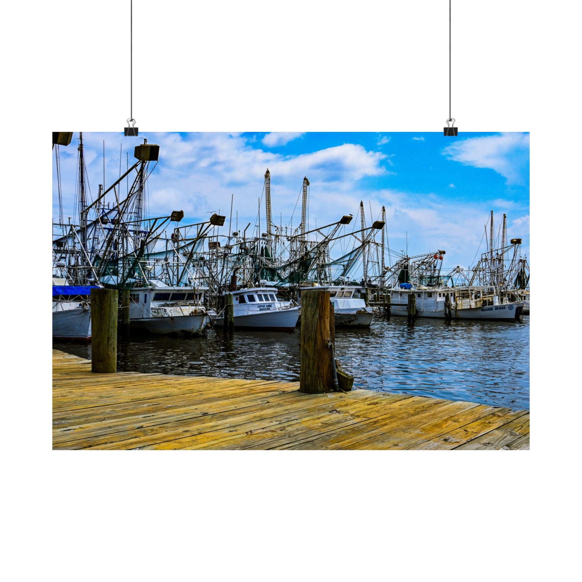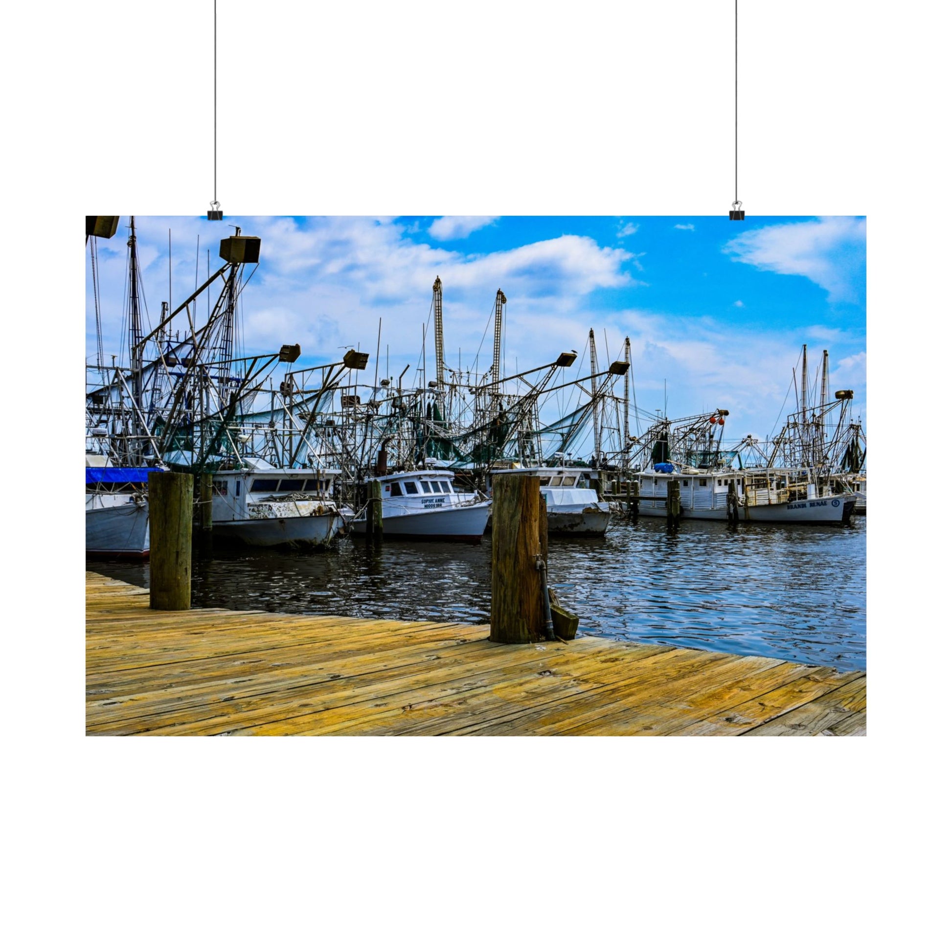 Nautical Matte Horizontal Poster - Serene Harbor Dock Scene with Fishing Boats