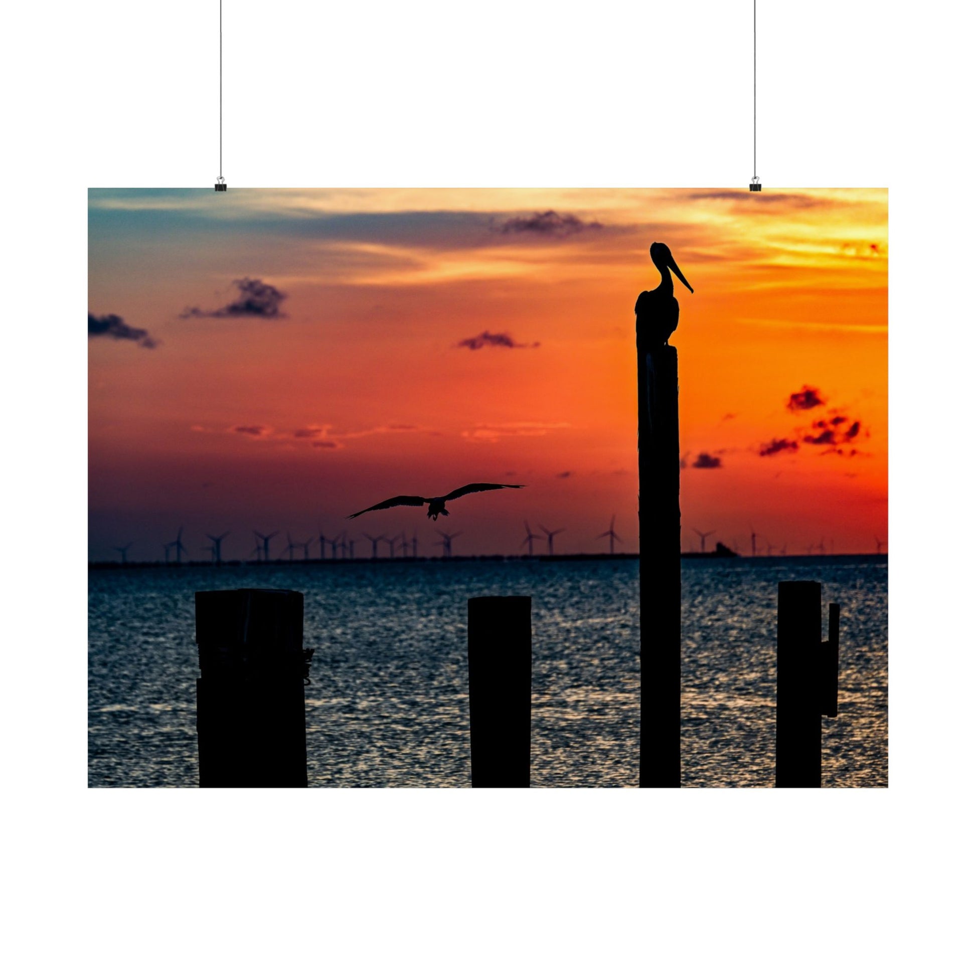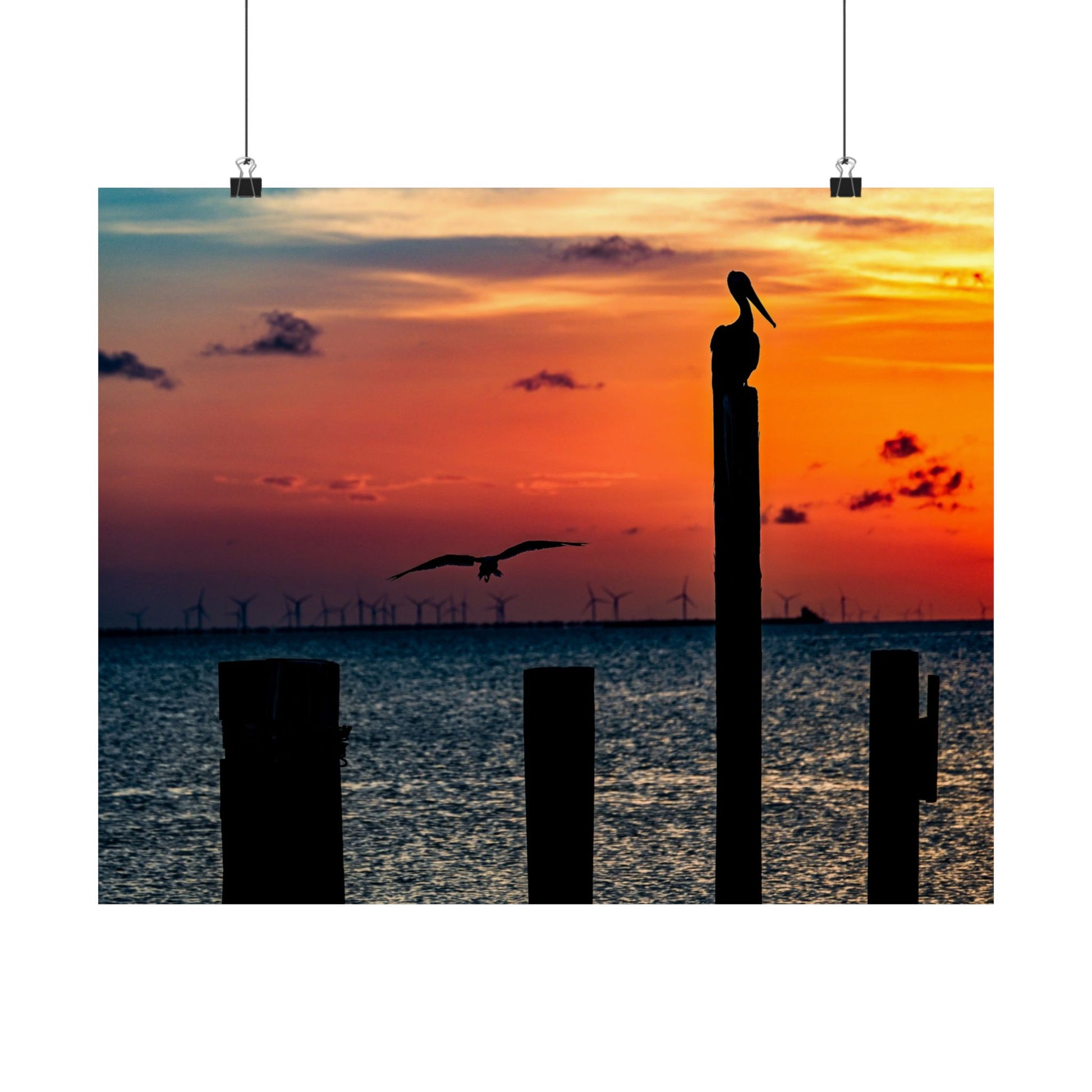 Scenic Matte Horizontal Poster - Serene Sunset with Pelicans and Wind Turbines