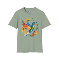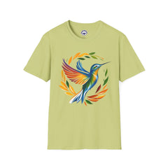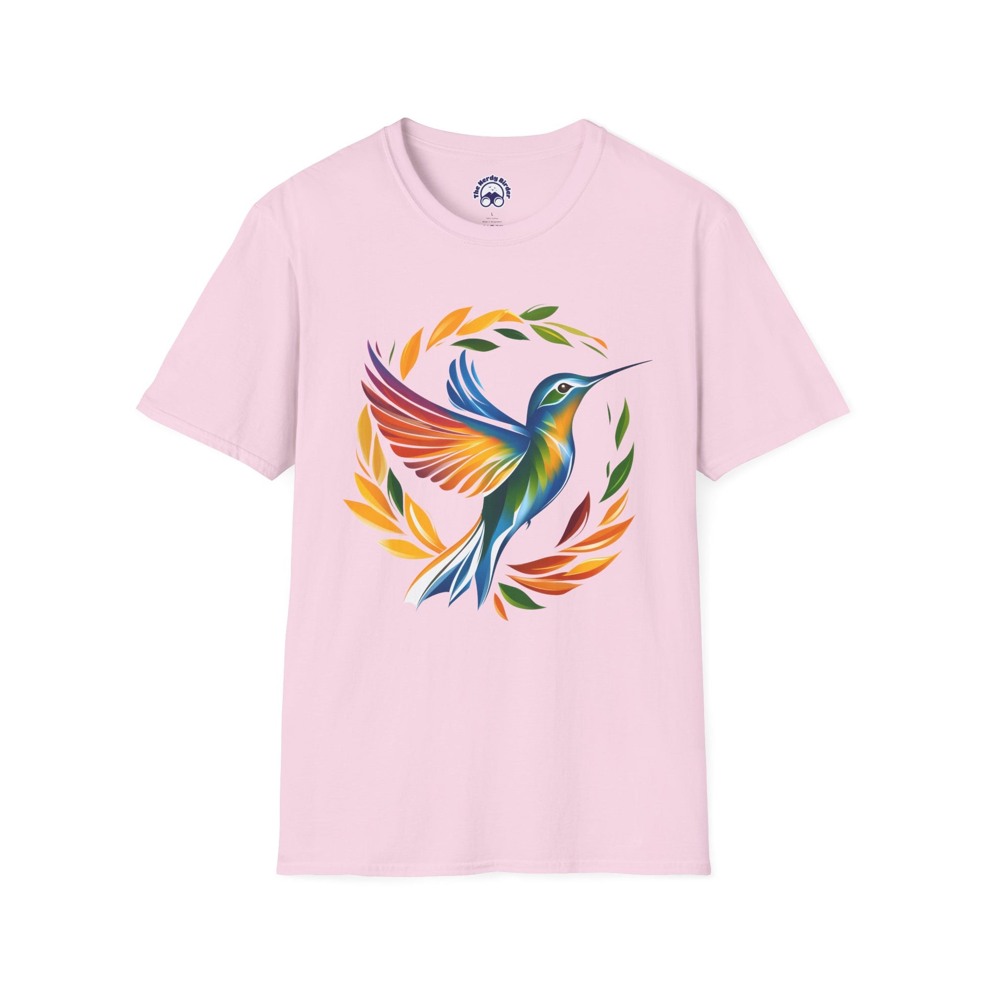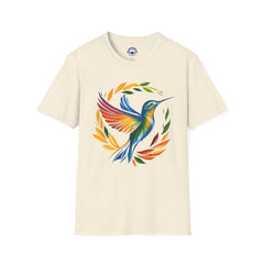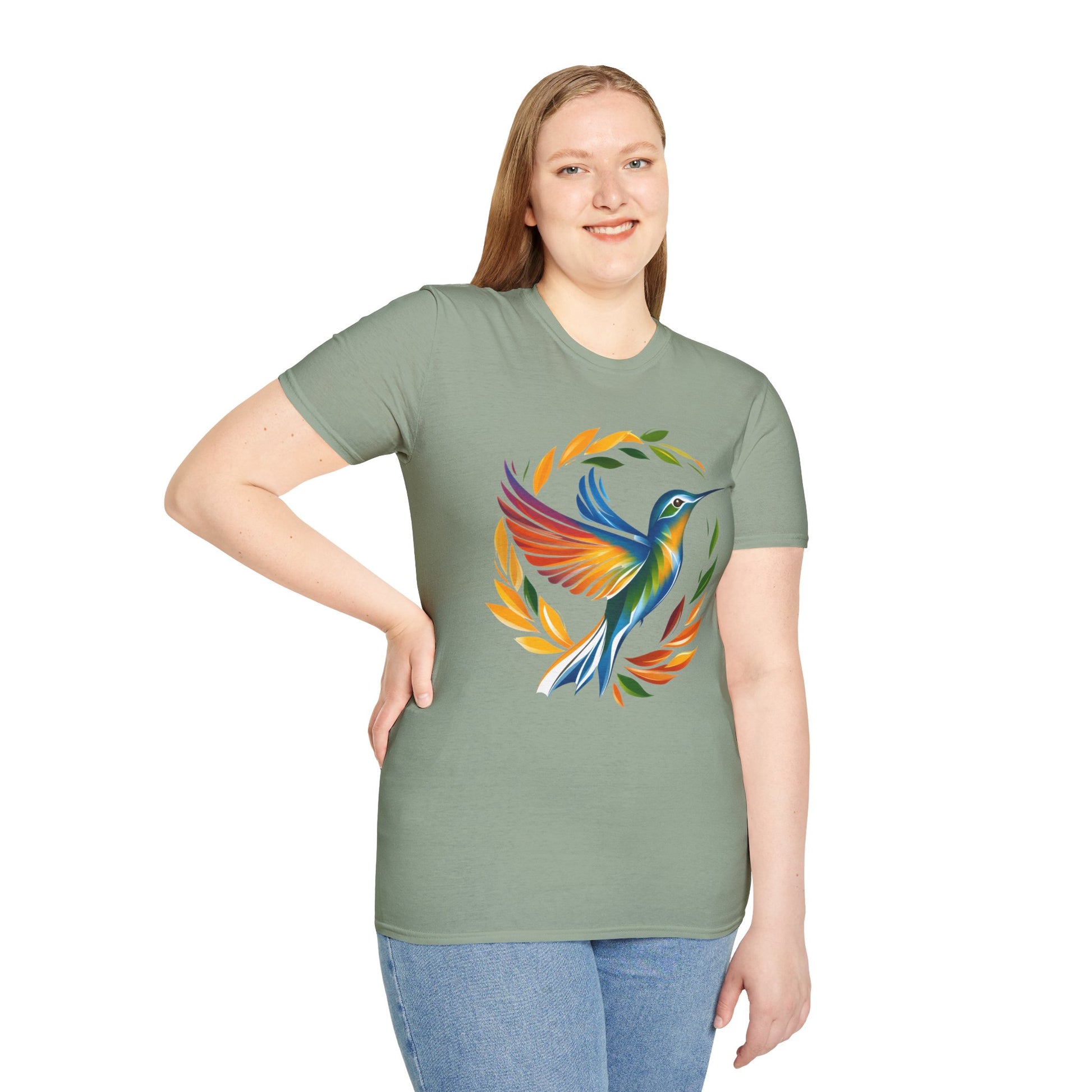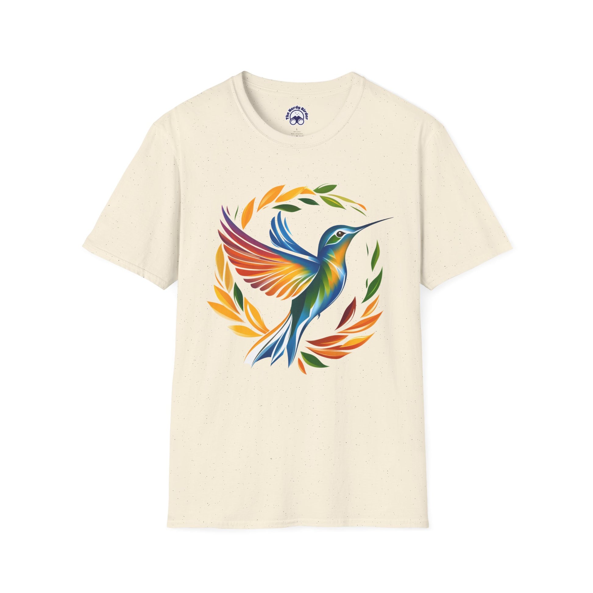 Add a burst of color to your wardrobe with our Modern Rainbow Hummingbird T-Shirt. This stunning design features an abstract hummingbird in flight, crafted with bold strokes of electric blue, sunset orange, and deep green—surrounded by a dynamic wreath of swirling leaves in vivid fall hues.